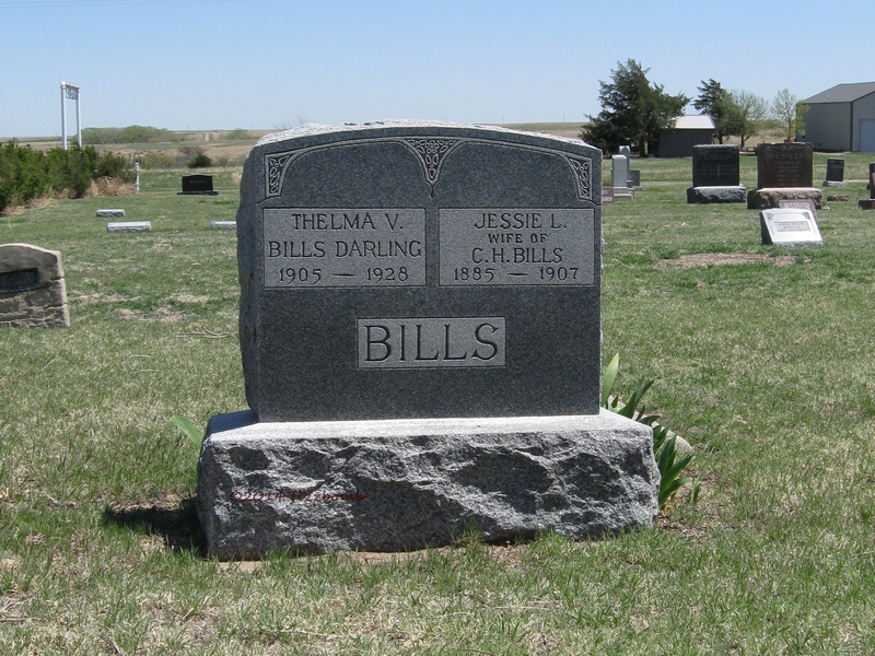 | Bills | Jessie L. | 9/11/1884 | 8/1/1907 | Wife of C.H. Bills; Aged 22y 10m 19d; Footstone: Mother | Same stone as Thelma V. (Bills) Darling. Obit on file in city office and Norton Co. Genealogical Society. First wife of Charles H. Bills. | |