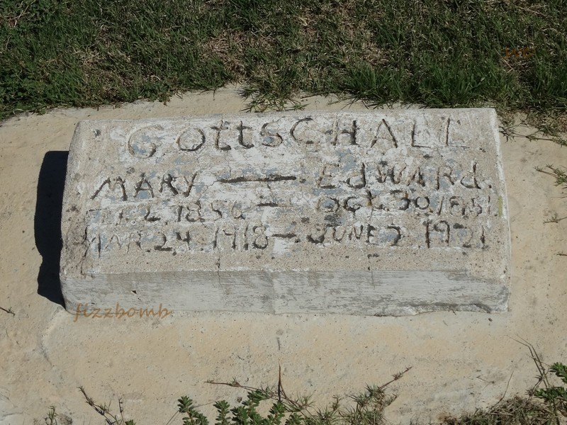 | Gottschall | Mary | 2/2/1856 | 3/24/1918 | Homemade concrete stone, inscriptions worn. Same stone as Edward Gottschall, | | |