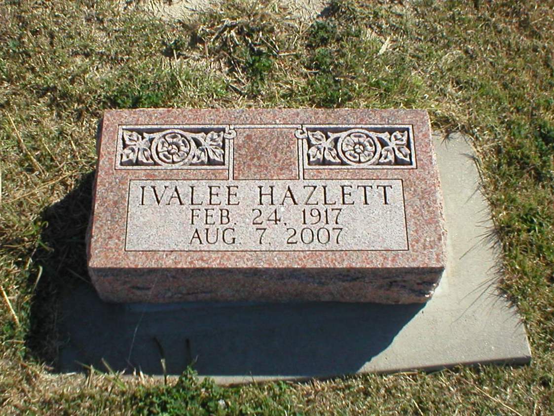 | Hazlett | Ivalee B. | 2/24/1917 | 8/7/2007 | Daughter of Charles Merle and Bessie V. Hazlett. Obit | | |