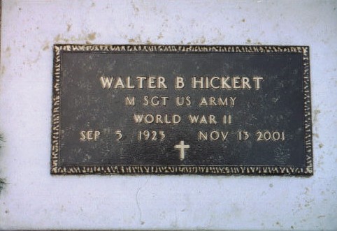 | Hickert | Walter B. | 9/5/1923 | 11/13/2001 | Married October 31, 1942; Parents of Donald, Oct 2, 1943 | Same stone as Alene Hickert. Picture on the stone. Also military marker: Walter B. Hickert; M Sgt US Army; World War II; Sep 5 1923 - Nov 13 2001 | |
