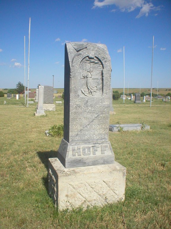 | Hoff | Polly | 6/25/1850 | 12/17/1944 | LIFE; TRUTH | Same stone as Amos Hoff. This stone has a beautiful relief carving of a storm tossed girl clinging to a cross. There is a small concrete marker next to this with no name. | |
